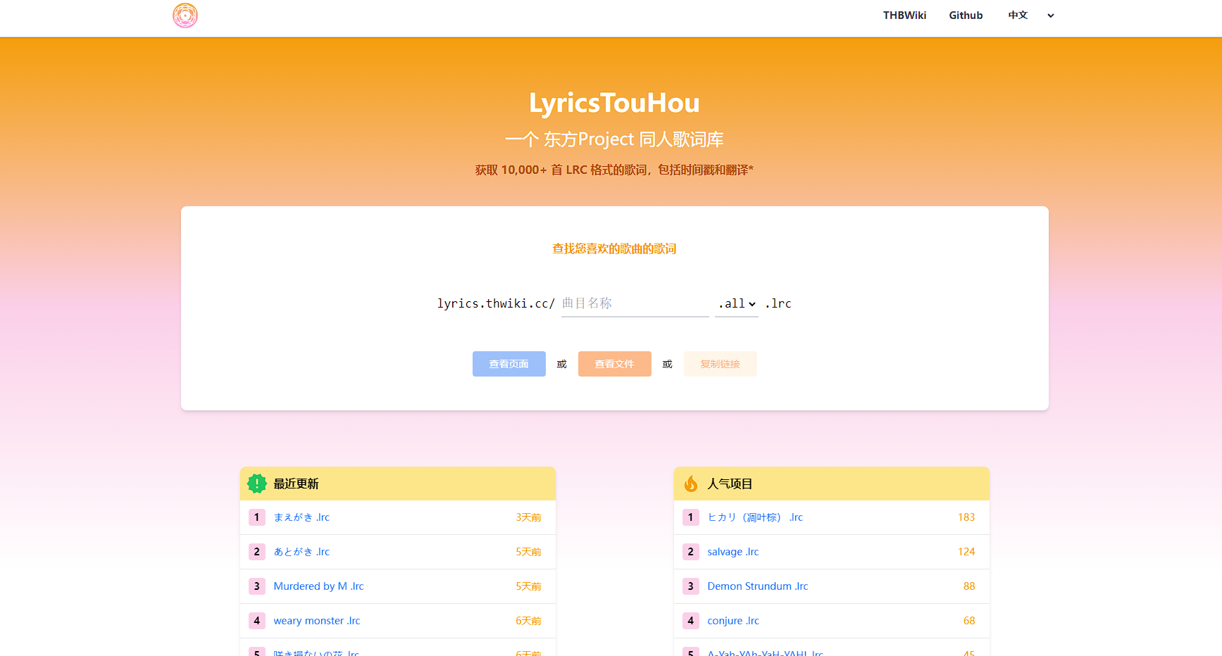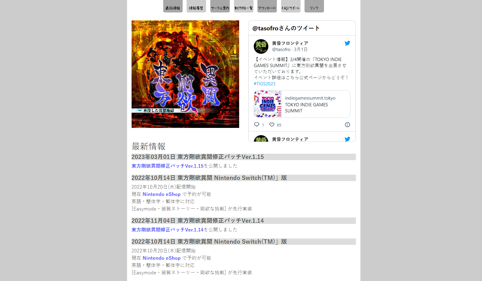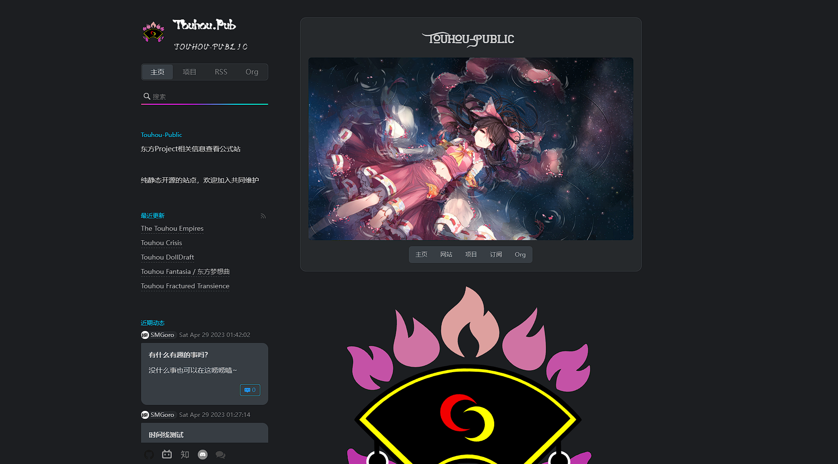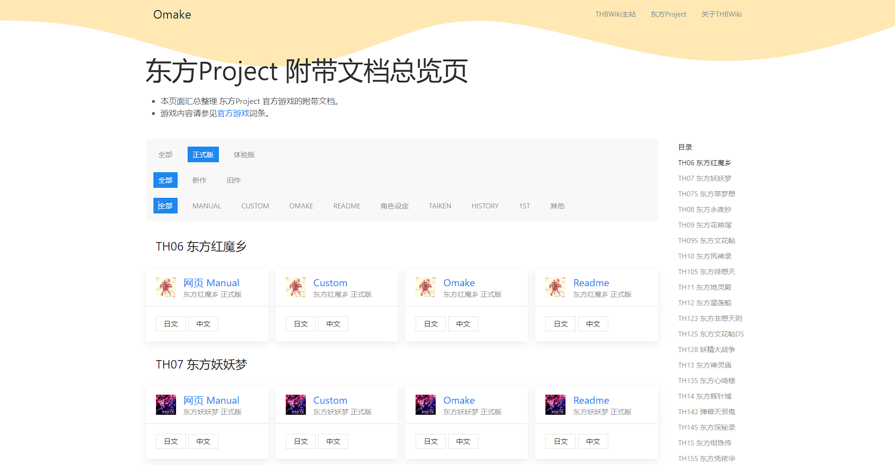 网站指南 Website Nav 东方Project相关的网站一览 Top 上海爱丽丝幻乐团上海爱丽丝幻乐团官网东方四方山新闻东方Project相关新闻网站Touhou.PubTouhou Public WebsiteTouhou-PublicTouhou-Public Github Org Wiki THBWiki国内优秀的中文东方wikiTouhou.Info日本非官方性质的东方wikiTouhou Wiki国外英文的东方wikiWikipedia TouhouWikipedia上的东方记载Fandom TouhouWikifandom上的Touhou英文wiki Music TouhouDB东方音乐收集库Touhou_Piano_Library东方乐谱收集库th-music-video-generator东方音乐在线播放器東方同人音楽流通东方音乐流通官方网站gensokyoradio东方音乐播放器dizzylab东方同人音乐社团售卖信息 Tools Manga Translator图像文字翻译网站PatchyVideo东方视频集合网站Touhou.Group东方相关群组收集网站THBWiki工具箱东方相关群组收集网站中文东方人气投票东方相关群组收集网站封面展示站东方相关群组收集网站TOUHOU98 FONT东方相关群组收集网站TOHO FONT PROJECT东方同人字体设计集幻想乡柱状地图幻想乡同人地图预览同人歌词库一个 东方Project 同人歌词库附带文档总页一个 东方Project 官方文档库博丽神社崇敬会东方Project公认同人商店 BBS Touhou.CC相当老牌的国内东方论坛网站喵玉殿官作集结国内东方论坛网站东方小镇炒鸡老牌的国内东方论坛网站七曜境界炒鸡老牌的国内东方论坛网站 Games 东方狗下载站东方相关文件内容下载Touhou Mix东方题材的开源音乐游戏WeHou在线游玩网页STG为阿求续命东方题材的2048小游戏puzzle东方neta为主的推理型游戏大家的幻想乡东方题材国人开发的手游maribelhearnAbout Touhou Project GamesDoujinSTGDoujin STG弹幕游戏相关网站东方符斗祭东方符斗祭同人游戏论坛LuaSTG使用Lua开发STG游戏的引擎東方LostWorld東方LostWorld手游官网Touhou_AR東方 Arcadia Record 手游官网 Social Bilibili-东方频道B站东方频道分区知乎-东方话题知乎东方话题分区微博-东方话题微博东方话题分区贴吧-东方吧百度贴吧中的东方集中营Youtube-touhouYoutube Touhou tag videosniconico-東方niconico touhou tag videosTwitter-touhouTwitter Touhou tag ArticlePixiv-touhouPixiv东方标签绘图 Circles 梦缘社国内东方同人文刊乐团黄昏边境黄昏边境-tasofro社团官网京都幻想剧团东方同人动画社团京华万象展官网中国东方同人社团展会博丽神社例大祭日本博丽神社例大祭官网幻奏盛宴官网东方Project同人音乐演出活动NEETS东方同人交响乐团充满魔力的土地下一个大佬的东方相关博客时音 | 舞风幻想夏乡作者的官方网站THCSC东方同人社团信息查询站东方我乐多丛志东方同人社团信息查询站氷結幻想东方同人音乐社团网站